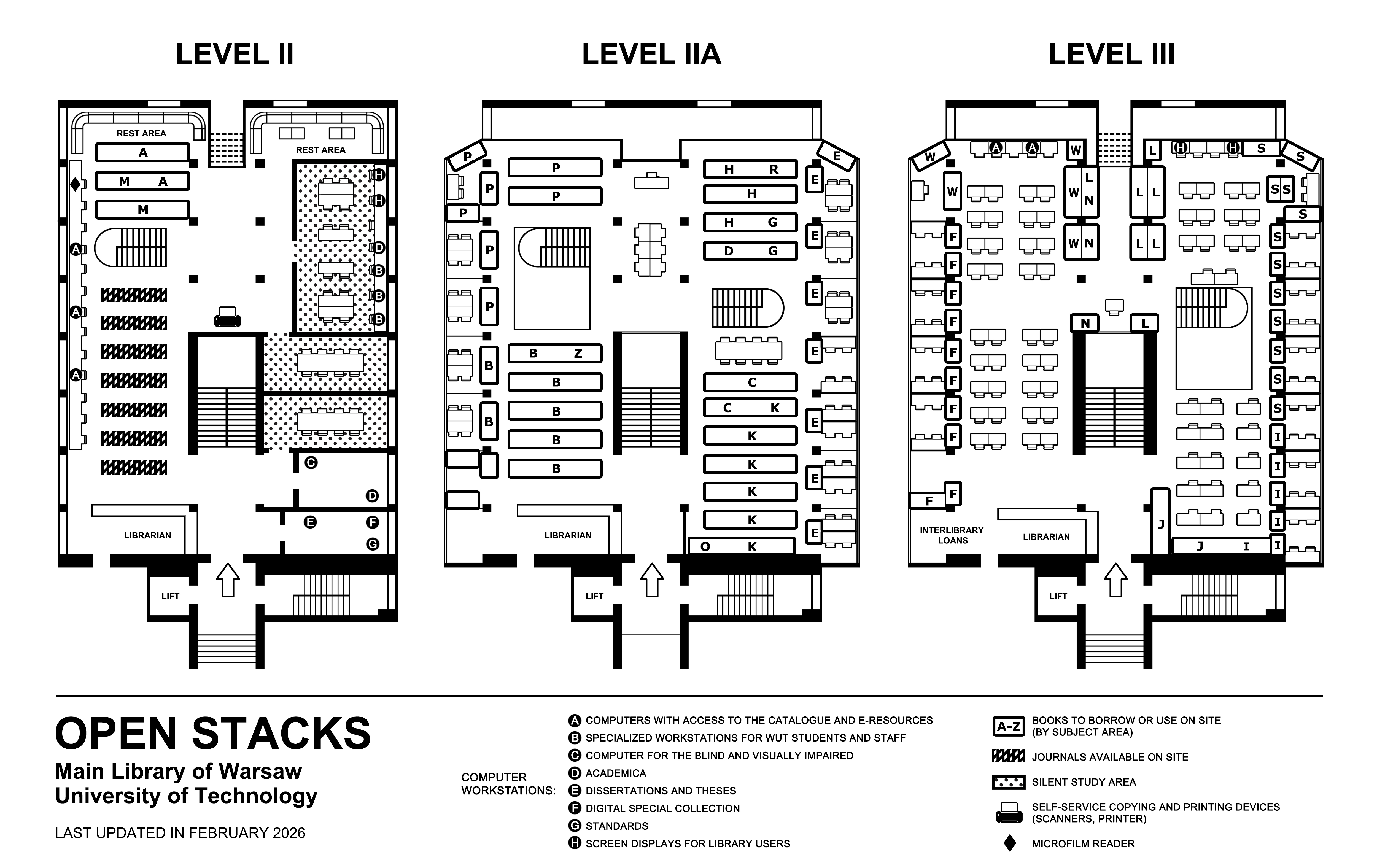 Specially prepared black-and-white Open Stacks maps in large easy-to-read A3 size are available at the library staff stations on each level of the Open Stacks.